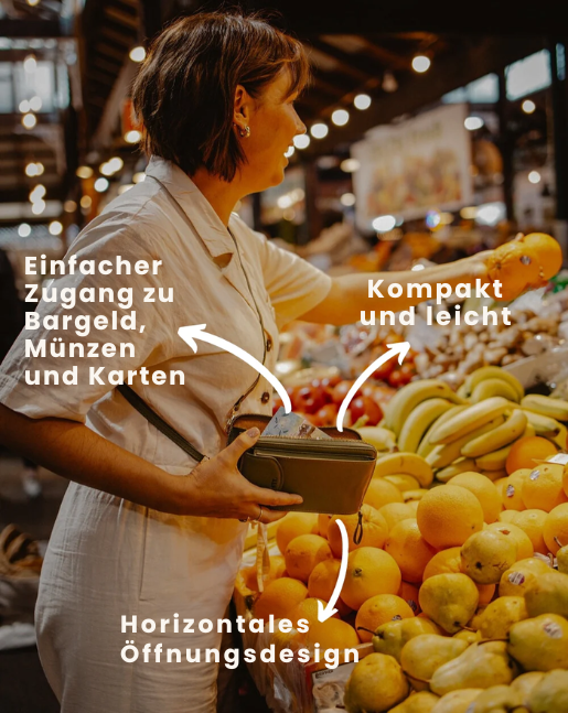 Der er plads til kort, kontanter, briller, nøgler, pas og mere. Tasken har også et ekstra udvendigt rum med trykknap, hvor du kan opbevare din telefon sikkert.