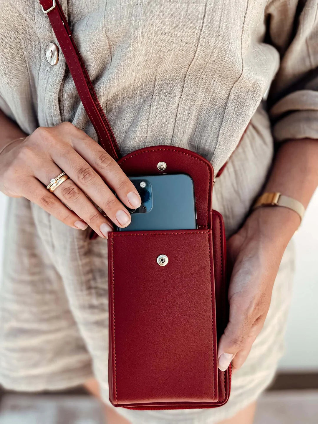 Bær den om håndleddet eller som crossbody* med den *aftagelige og justerbare rem.